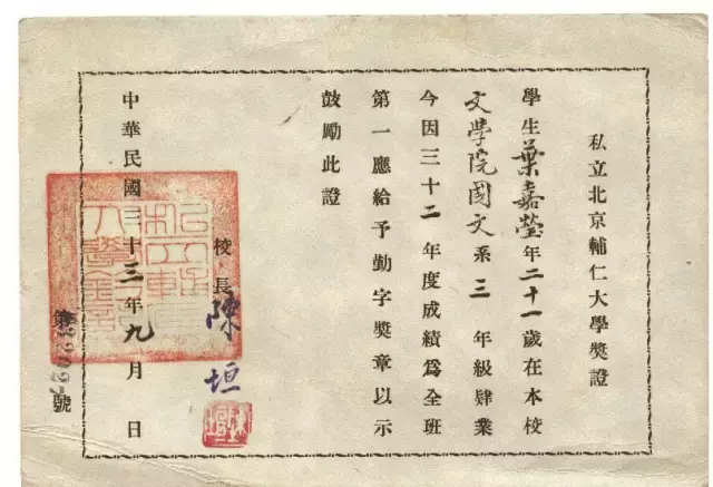 1941年,叶嘉莹考取了辅仁大学。中学时,文理科发展均衡,高中阶段用在数学上的精力比诗词还多,成绩也好,在报考大学时,她犹豫过是报考北大的医学系还是辅仁大学的国文系,前者出于实用考虑,后者出于兴趣。最终报了辅仁大学,主要是基于辅仁大学是教会大学、不受日伪控制,有一批有风骨的老师在执教。命运总是在电光石火间被写就。