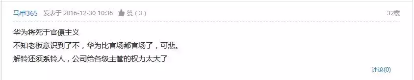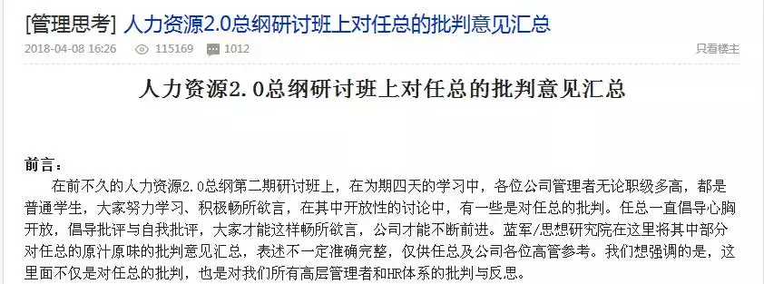 在华为官方论坛上,对官僚主义的批评比比皆是,比如有员工批评“很多领导只知道听汇报,从不下基层(下基层也是听汇报),高高在上,导致就是以领导为中心、PPT山会海、各种拍马奉承。”