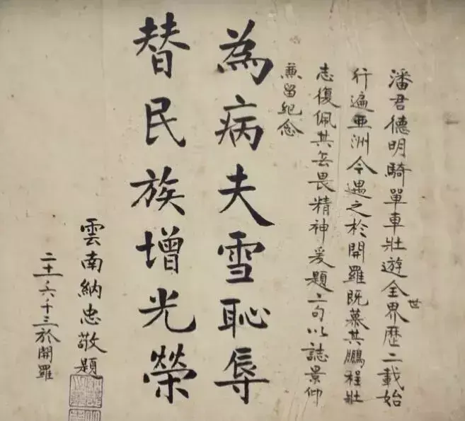 一见面,张学良就说:“潘先生,旅途三年,艰苦卓绝,汉卿敬佩之至。”并在《名人留墨集》写下了“壮游”二字。