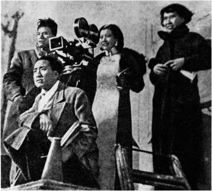 ▲阮玲玉(中)在拍摄《新女性》时与蔡楚生(前蹲者)合影