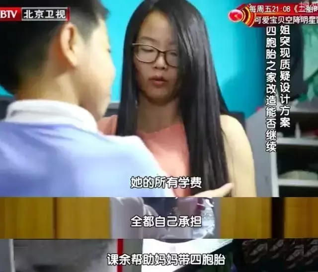 由于家里孩子太多,餐桌旁坐不下那么多人,蒋娜只能站着吃饭;由于家里的钱都用在培养四胞胎上了,上大学之后,蒋娜勤工俭学,解决了自己的全部学费,一有时间还要辅导四个弟弟。