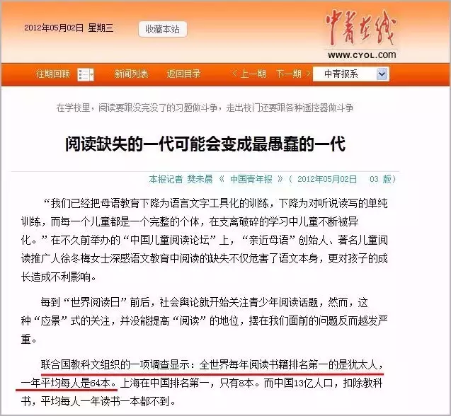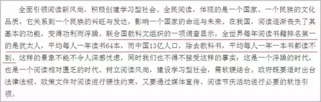 联合国教科文组织的一项调查显示,全世界每年阅读书籍排名第一的是犹太人,平均每人一年读书64本,而中国13亿人口,除去教科书,平均每人一年一本书都读不到。
