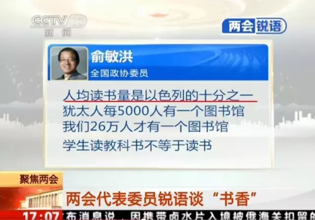 ➤ 2015年两会期间,俞敏洪提出的“人均读书量是以色列的十分之一”,其依据,也是所谓的“64本”。