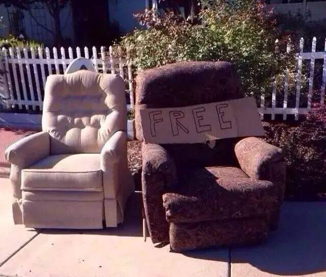 有扔旧货就有捡旧货的。美国的公寓里多半不提供家具,只是一个空房。购置家具又是一笔费用,所以在这边,无论是中国还是美国的大学生,街边捡家具就成了必备技能。那些从街边捡来的家具,也许它们的上一个主人也是把它们从街边捡来的。真是物尽其用。