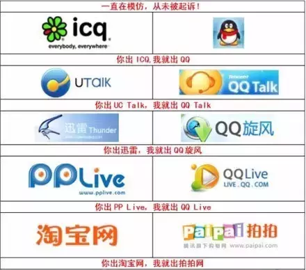 哪怕是如日中天的腾讯,也有一段山寨的“黑历史”:QQ模仿ICQ、腾讯TM模仿MSN、QQ游戏大厅模仿联众……马化腾曾毫无讳言地说,“模仿是最稳妥的创新”,但模仿之后,“超越”成了腾讯的主旋律。