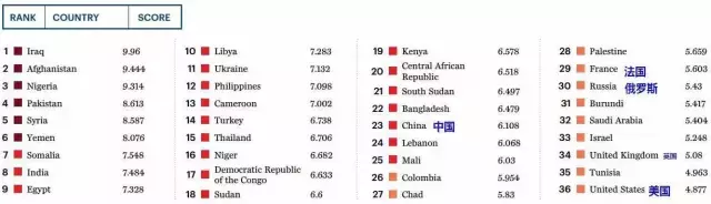 然而,澳大利亚智库经济与和平研究所(IEP)发布《全球恐怖主义指数报告(2016)》显示,中国排名世界第23位,属于受恐怖主义影响高的地区,甚至高于法国(29位)、俄罗斯(30位)、英国(34位)、美国(36位)。