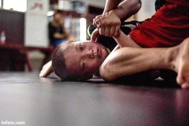 2017年6月2日,四川成都,一名男孩参加格斗训练,满头大汗被摁倒在地上。