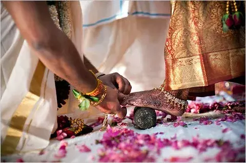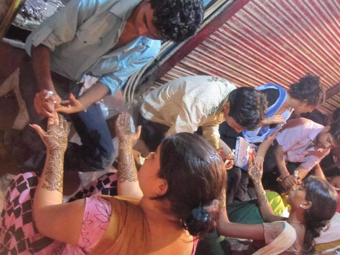 在婚礼前夜,新娘要由未来的婆婆点下第一笔手绘图案,并由资深手绘师接着画下最精美最复杂的图案,整个过程至少需要七、八个小时。新娘手绘的图案有很多讲究。许多花朵都代表了对新娘“多子多福”的祝福,孔雀和荷花是印度的国鸟和国花,象征着美丽、富贵,扬起鼻子的大象则代表家庭繁荣和好运。有时调皮的新娘女伴们还会把手绘变成一种游戏。她们把新郎的名字隐藏在新娘的手绘图案中,只有在这些图案中找到自己的名字,新郎才可以开始甜蜜的新婚之夜。