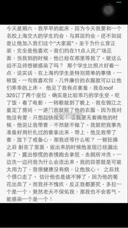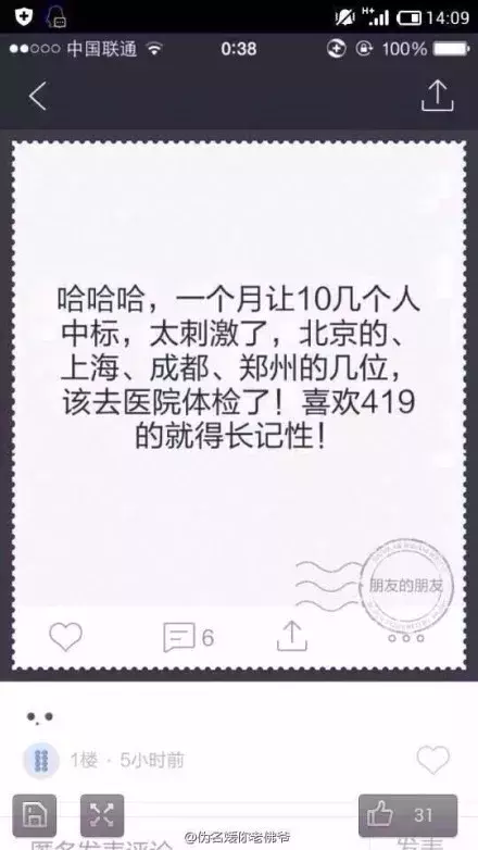 “哈哈哈,一个月让10几个人中标,太刺激了,北京的、上海、成都、郑州的几位,该去医院体检了!喜欢419(一夜情)的就得长记性!