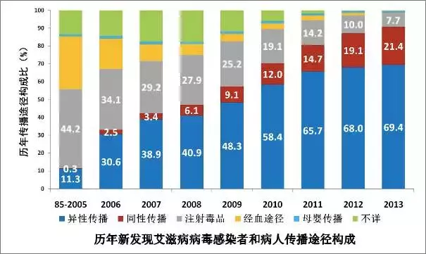 艾滋病的传染途径主要有血源性传播,性接触传播,母婴垂直传播。随着对血液制品的严格管控、对商业卖血的禁止,血源性传播已经减弱许多。目前性接触传播是主要途径。“根据国家卫计委公布的数据,2011年到2015年,我国15~24岁大中学生艾滋病病毒感染者净年均增长率达35%,且65%的学生感染发生在18~22岁的大学期间。性传播为主要传播途径。”