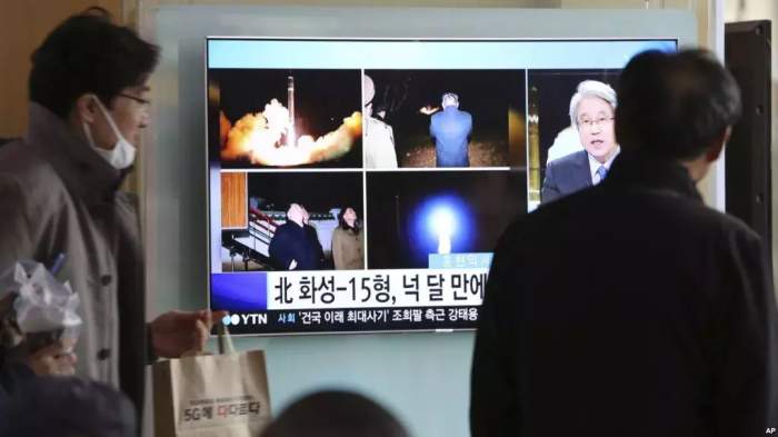 人们在首尔火车站观看有关朝鲜发射导弹的电视新闻