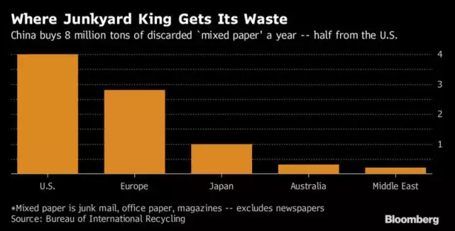 中国曾是美国洋垃圾的“进口”大国,2016年美国将塑料、金属等价值56亿多美元(约合人民币370亿元)的废料出口到中国。但据彭博社最近的报道称,中国禁止进口洋垃圾后仅10月以来,俄勒冈州当地不得不将800吨废品就地填埋掉。而且为了让垃圾达到出口中国的标准,美国的环卫公司增加了分拣人手、升级了设备,Waste Management公司甚至不惜重金购买光学分拣器,只为能符合中国的垃圾出口标准。