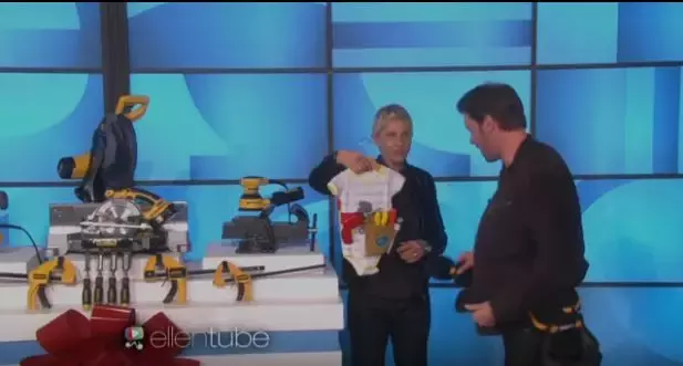 美国著名脱口秀节目《艾伦秀》主持人艾伦在现场给嘉宾送礼物,送的都是工具,还不忘记给宝宝也送一套