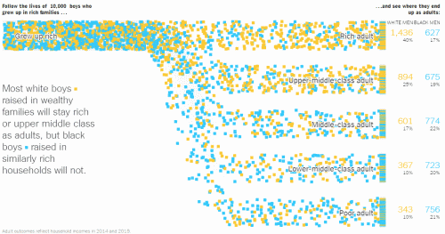 下面这张图片,展示了研究报告的主要内容:即便你出生在富裕的白人家庭,仍然很可能跌落到社会底层。