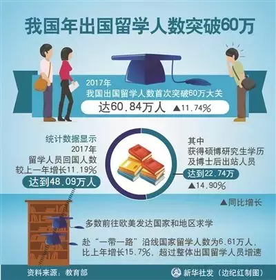 2017年,中国出国留学人数首次突破60万大关,达60.84万人,继续保持世界最大留学生生源国地位。