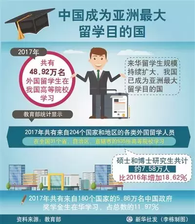 先看一条新闻,教育部最新的数据显示,2017年,来中国学习的外国留学人员,已达48.92万人,中国成为亚洲第一大留学目的国。