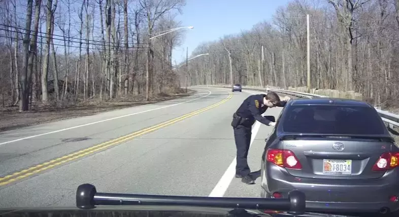 3月31日,美国新泽西州,两个警察在高速路边拦下了一辆违章的轿车。