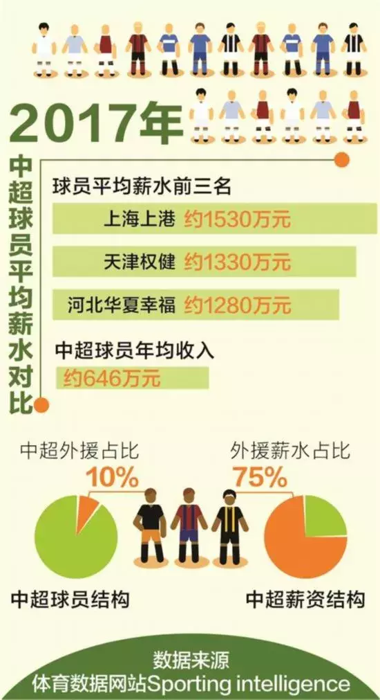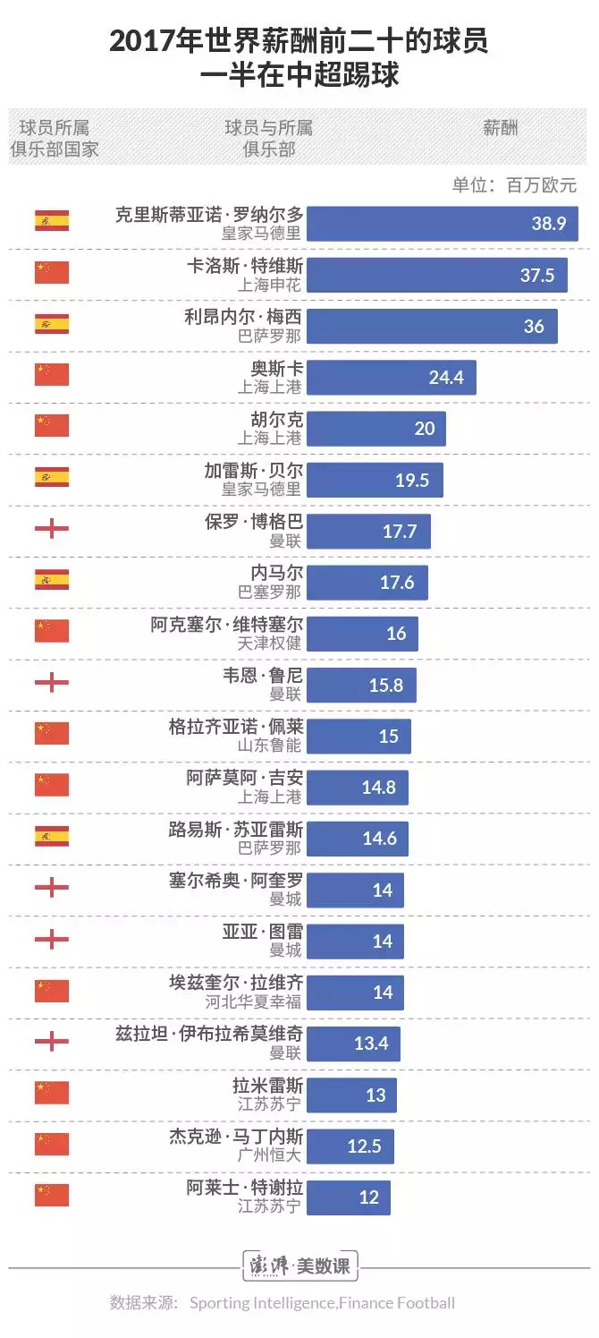 2017年,中超联赛一线球员的平均工资,在全世界排名第11位,其年薪超过1000万美元的球员人数,仅少于英超,远远地把意甲、德甲、西甲这些欧洲5大联赛的豪门甩出八股道外。