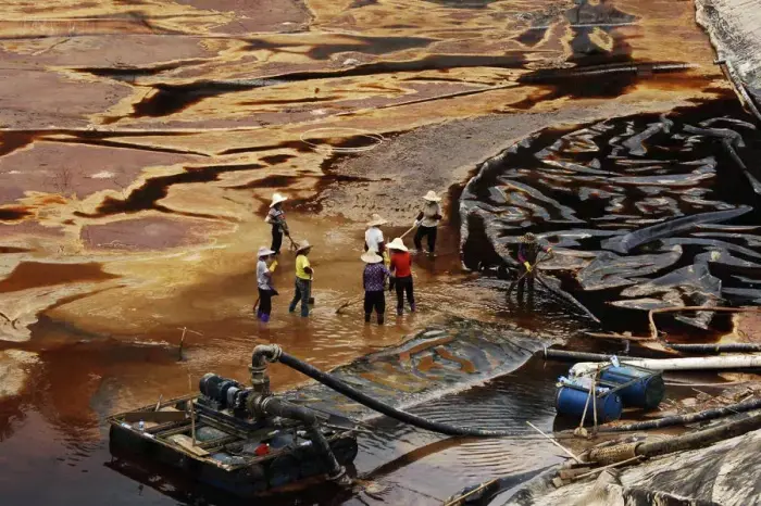 紫金矿业污染事件:工人正在处理位于福建上杭紫金山铜矿湿法厂污水池中的含铜酸水。中新社王东明摄