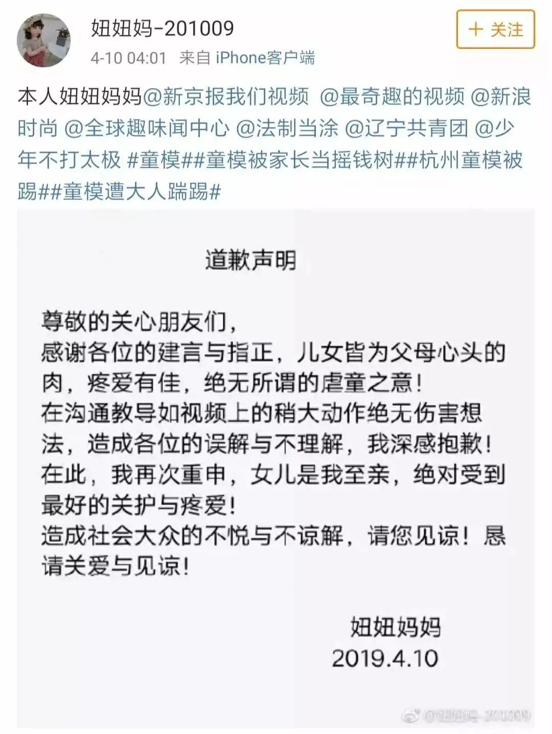 迫于舆论压力,妞妞妈终于在4月10日凌晨的时候发声了,公开向大众“道歉”,表示儿女都是父母心头肉,自己绝无虐童的想法。
