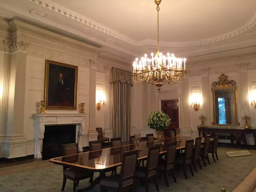 穿过这三个房间,就来到呈长方形的国宴厅了。中间摆着一个长桌,两边各放了七把椅子,并不觉得豪华。但白宫的导游图上说此处最多能宴请130位客人,我估计是把长桌撤掉,摆上十几张圆桌,不过那样就显得有些拥挤了。墙上一幅林肯的大画像,身穿黑色西服,坐在一张椅子上,手托瘦削的下巴,用忧郁的双眼注视着来到大厅的芸芸众生,不知道他在作何感想。