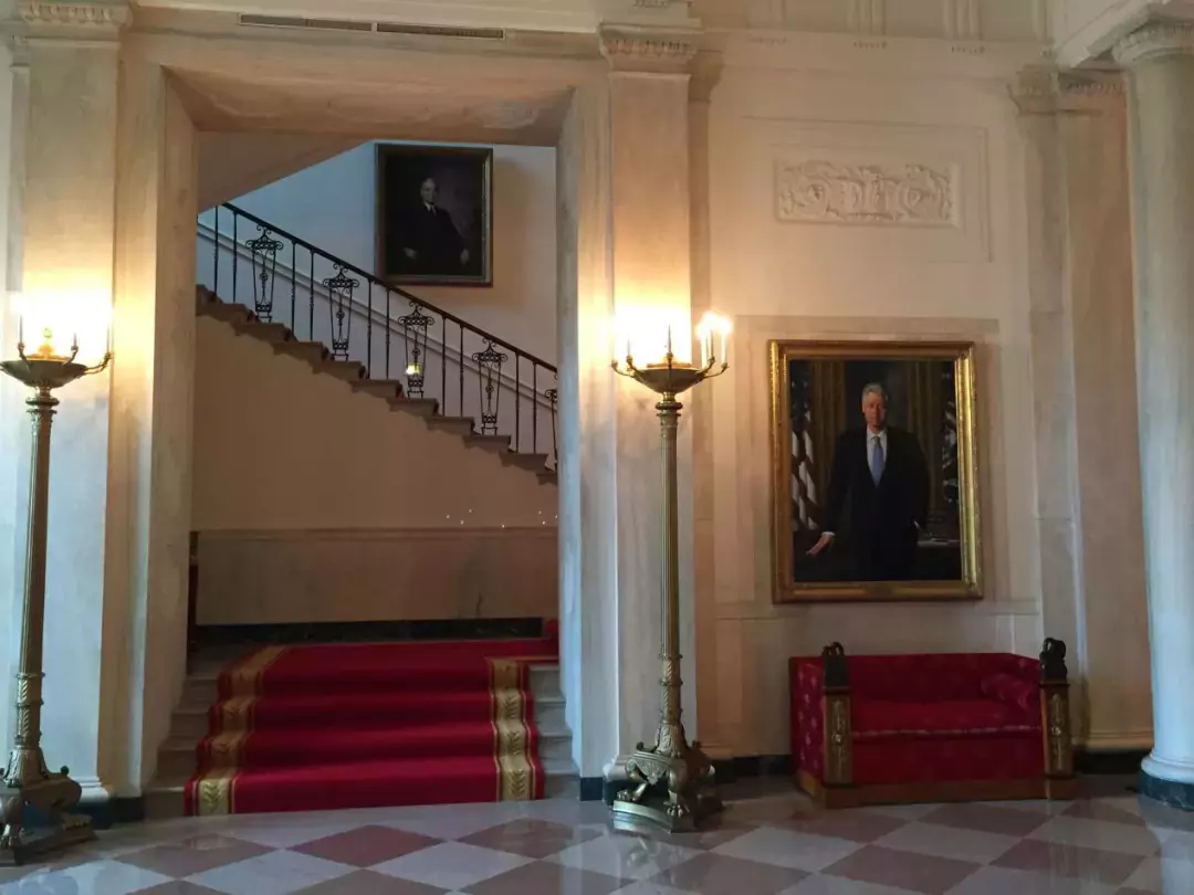 转过宴会厅,就来到前门厅。墙上悬挂着几位前总统的油画肖像,我仔细看过后觉得画师的水平一般,谈不上一流或大师级的作品。大门右侧摆放了一架钢琴,是著名的斯坦威钢琴公司在1938年赠送给白宫的。正对大门的地方就是蓝房,门边立了两杆旗,顶上挂着一个圆形的总统徽标。左侧有楼梯通往二楼,但参观者止步。