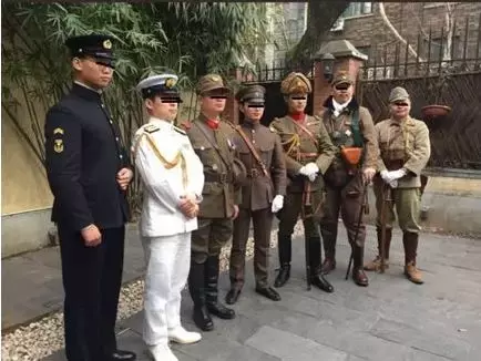 据说,这次拍照大概就是“战争末期曾经参与过上海事变(指“八一三”淞沪抗战,日本称之为第二次上海事变)的将校故地重游”。从左至右的着装依次是日本海军防暑衣、日本海军的几种军服。