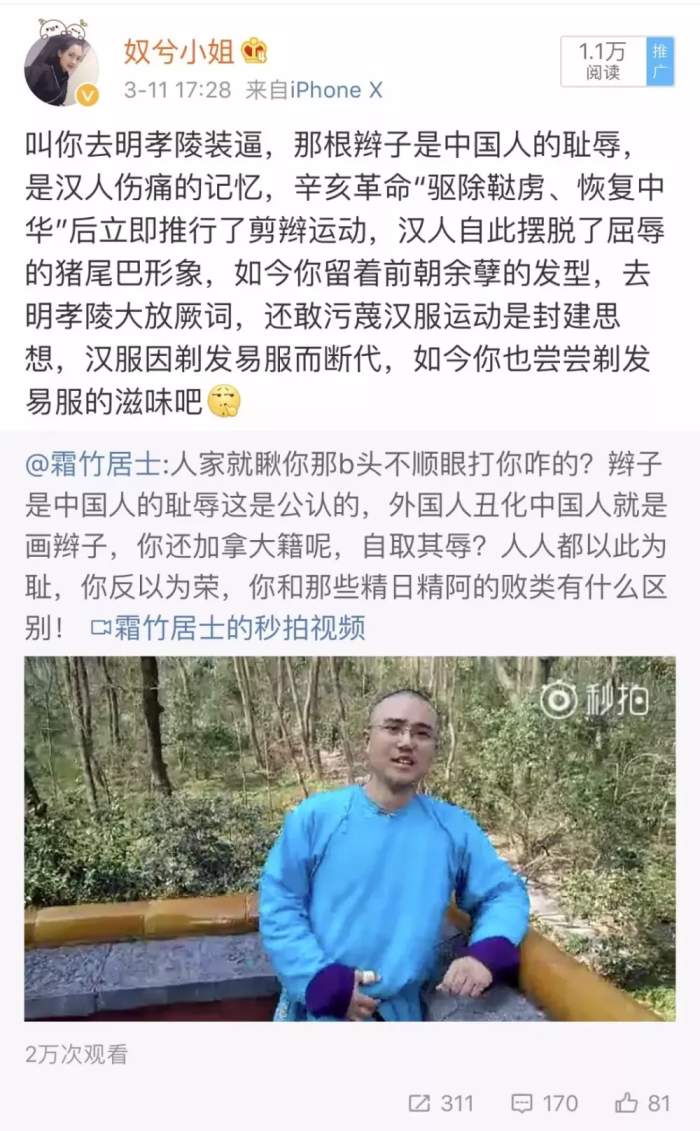 网友@奴兮小姐:“叫你去明孝陵装逼,那根辫子是中国人的耻辱,是汉人伤痛的记忆,是华夏民族被满清奴役压迫的黑暗历史!也是中国近代以来被西方视作东亚病夫的屈辱史!君可知,那条辫子,沾了多少汉人的血泪、趟过多少汉人的血肉之躯?扬州十日、嘉定三屠、江阴城81日的全城血战……数不清的不屈的汉人为此抗争,流不尽的血液浸染着血泪的中原,残酷的剃发令终究让汉人做了亡国奴,留起了屈辱的金钱鼠尾,自此华夏沦亡!”