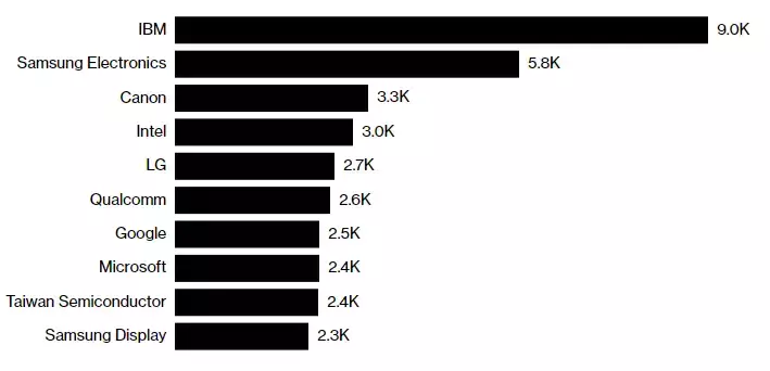 2017年,三星电子获得的美国专利数量,仅次于IBM,位居第二,三星显示器位居第十。如果以三星集团计算,必然超过IBM。