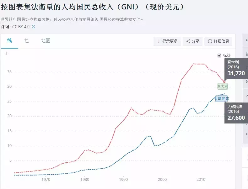 (意大利与韩国人均国民总收入对比 来源:世界银行)