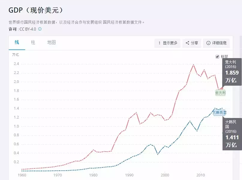 再看GDP,2016年,意大利是1.859万亿美元,韩国是1.411万亿美元,相差不到5000亿美元。