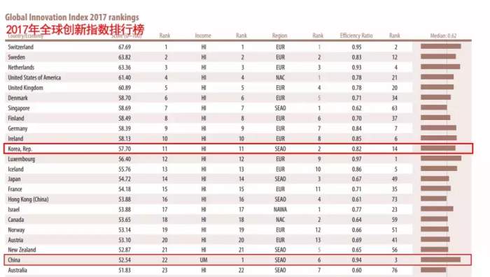 2017年全球创新指数排行榜中,韩国排名第11位,高于日本和法国。