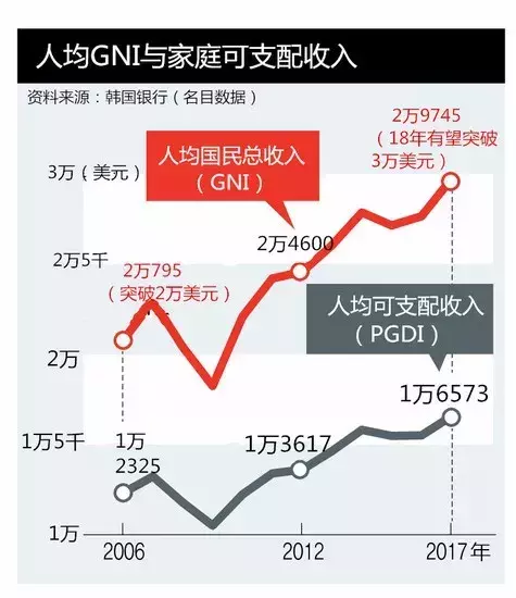 近日,韩国央行公布的数据显示,韩国的人均国民总收入(GNI)达到了2.9745万美元(约合3363.6万韩元),逼近3万美元。