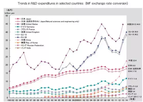 (世界各国投入到R&D研发的经费支出 来源:日本文部科学省2016年版报告)
