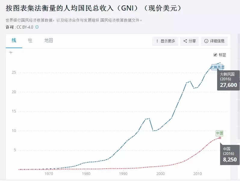 (中国与韩国人均国民总收入对比 来源:世界银行)