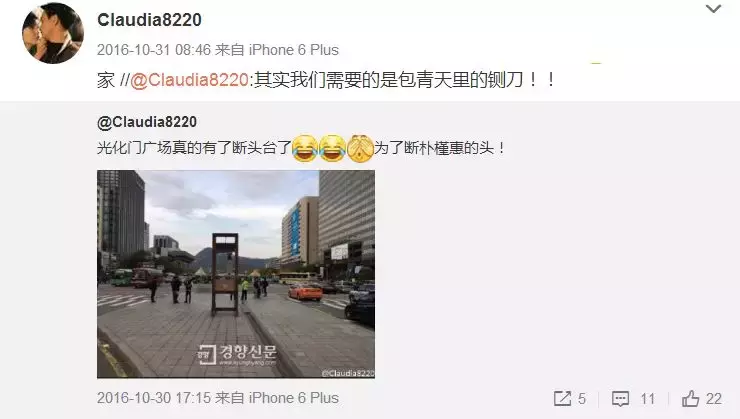 当时局长就觉得,这断头台很有中国古装影视剧的风采啊。果不其然,熟悉中韩文化的韩国网友“Claudia8220”就在微博里调侃道:其实我们需要的是包青天里的铡刀!!