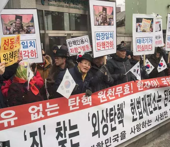 朴槿惠被停职后,朴槿惠的忠诚支持者,在宪法裁判所前集会示威,手举标语牌,要求公正调查,还朴槿惠一个公道。