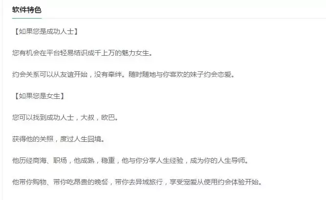 软件特色,也写得那么“美好诱人”,专为成功人士和女生设计。