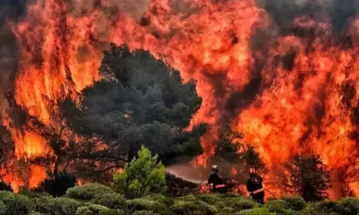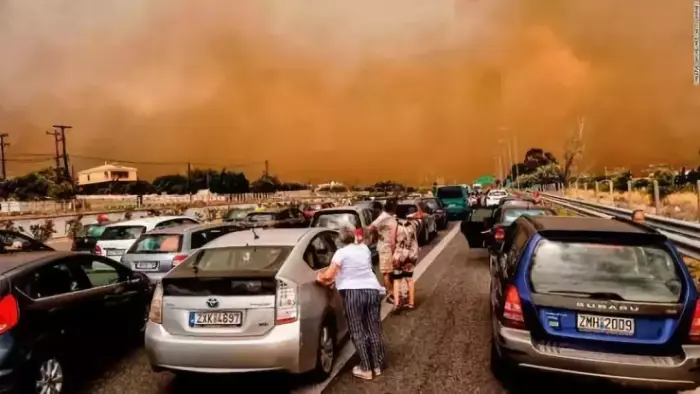 在希腊,野火烧起来完全不受控制,因为火势过猛,交通瘫痪,车辆堵塞。