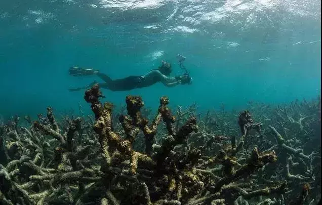 然而现在却是这样的,整整1500公里的珊瑚礁枯萎死去,静静地躺在水底,如同累累白骨,宛若一片坟场。