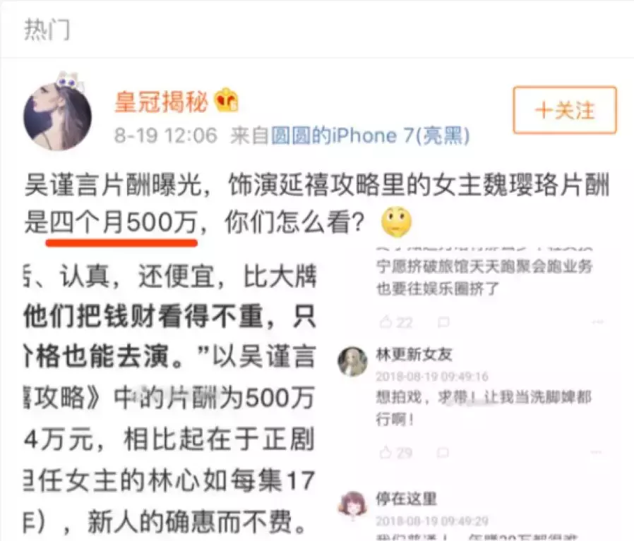 一部大热的《延禧攻略》,让演员们的片酬上了几次微博热搜榜,吴谨言500万,聂远300万,佘诗曼200万……网友们纷纷打抱不平:这也太低了!然而,这个价位真的“正常”吗?