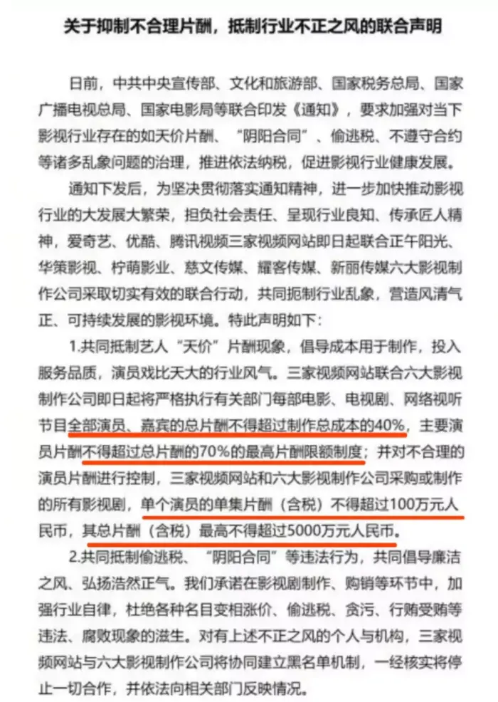 其中规定:单个演员的单集片酬(含税)不得超过100万元人民币,其总片酬(含税)最高不得超过5000万元人民币!