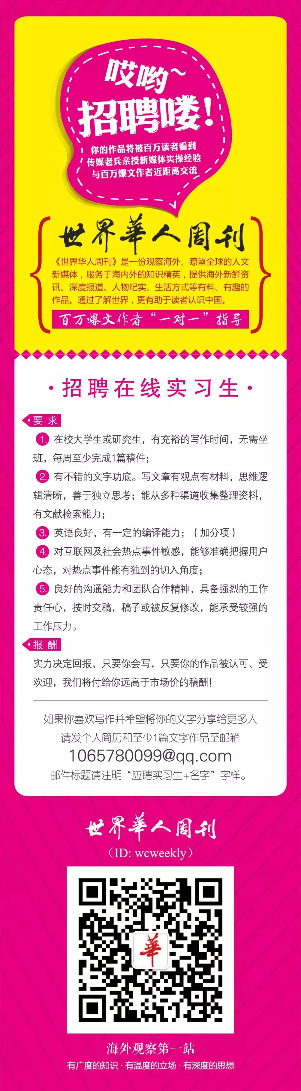 投简历前先阅读“世界华人周刊”微信公号(wcweekly)往期内容。日常选题包括但不限于:海外的价值理念和生活方式,题材可以是故事、人物,也可以是新鲜有趣的生活方式、世界观。