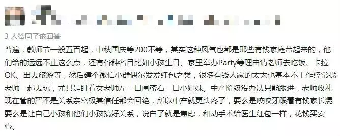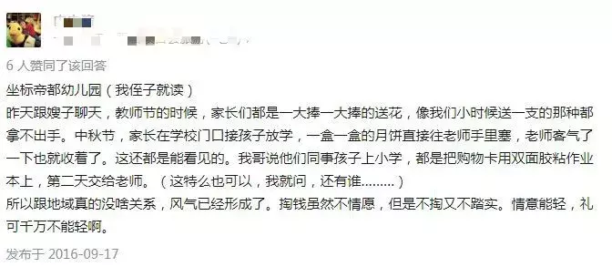 最后,也要承认无论是美国还是中国都会有个别师德败坏的老师存在,他们确实会“看礼下菜”(美国的老师为此付出的代价会惨重,所以比例远小于国内)。网上就有一位中国家长报出过班里的老师说“谁送礼我可能不记得,但没送的我一定记得。”听到这类话家长敢不送?也是无奈。