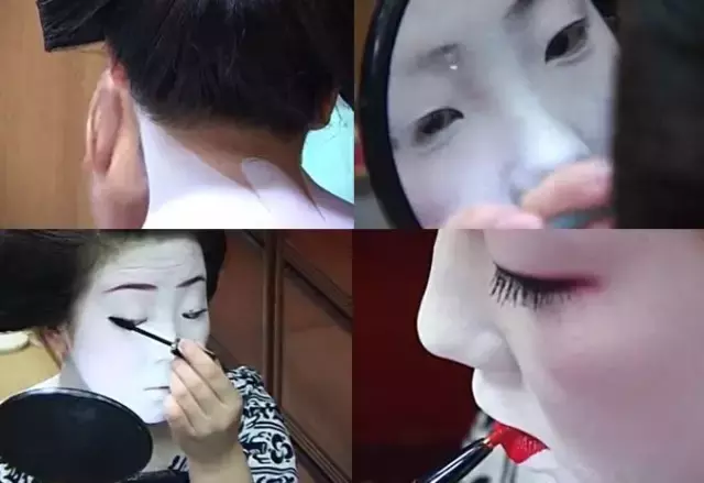 化妆也要按照严格的程序来,先从脖颈开始,然后是面部、眼眉,最后是嘴唇。妆容画完,粉妆玉砌。