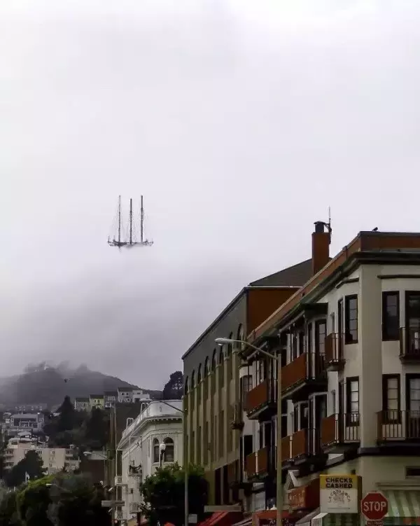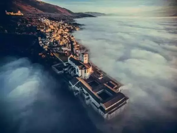 被云雾笼罩的塔尖,看起来像一艘来自天边的幽灵船