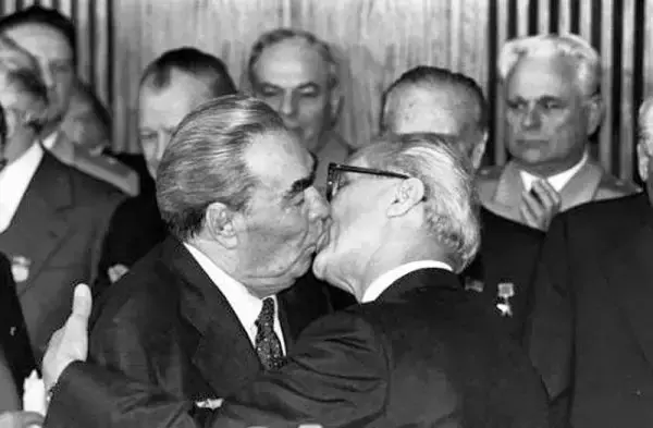 1979年10月4日,勃列日涅夫与东德领导人昂纳克在庆祝民主德国建国30周年庆典上激烈拥吻。后面的兄弟们表示辣眼睛。