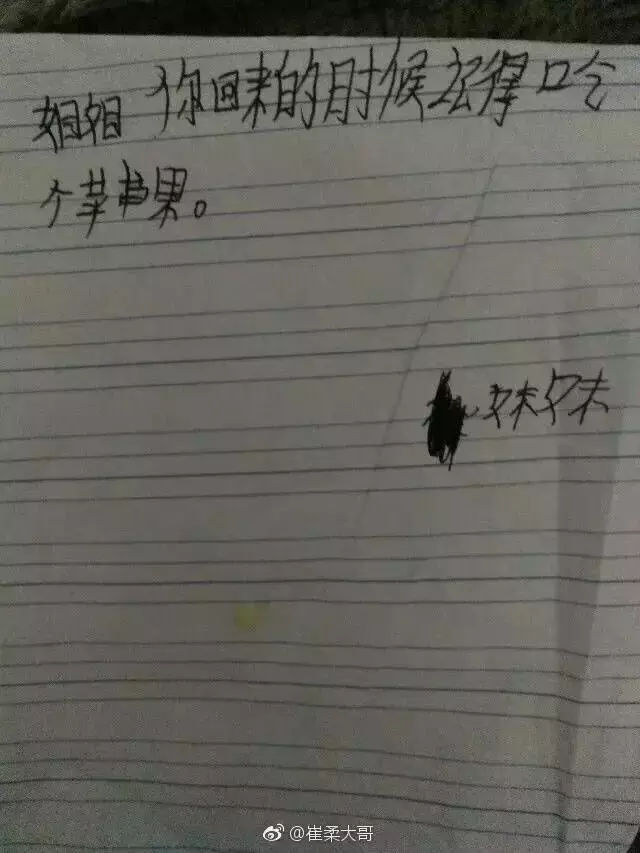 晚上我回家,看到十一岁的妹妹给我留的字条,她已经睡着了 。