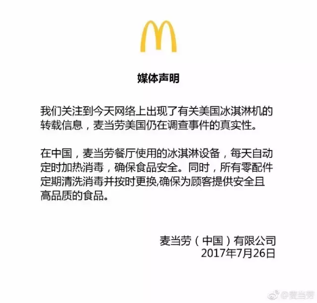 昨天夜里23时许,麦当劳(中国)有限公司发出紧急声明:“麦当劳美国仍在调查事件真实性。在中国,麦当劳餐厅使用的冰淇淋设备,每天自动定时加热消毒。”
