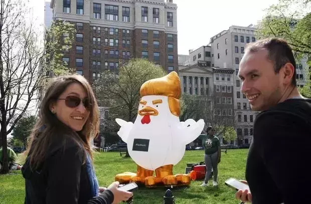 早在今年4月,就有抗议者将一只充气鸡摆放在华盛顿街头,要求特朗普公布个人纳税信息。